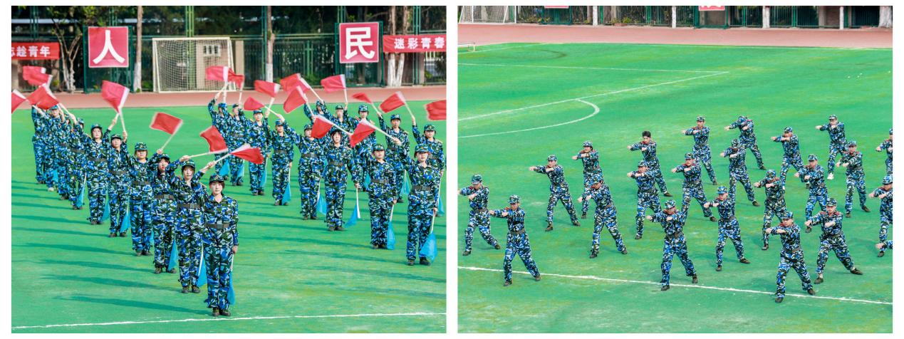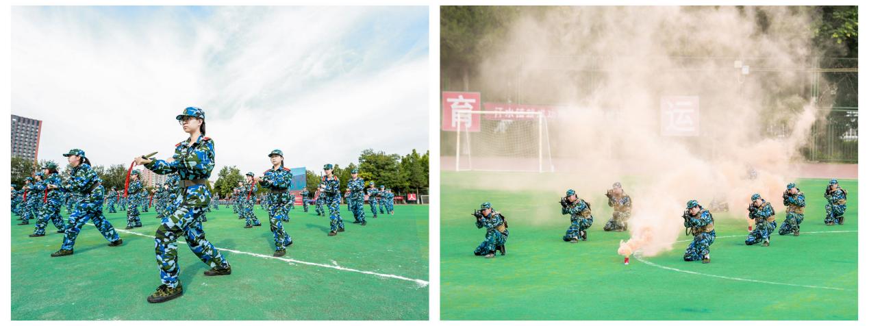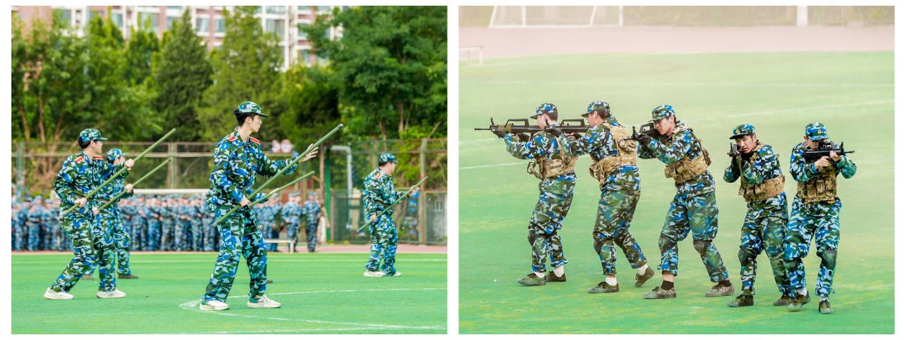 参训学生进行战术、擒敌拳、刺杀操、应急棍、防爆盾、旗语和匕首操等军事科目汇报表演。特色科目训练不仅锤炼了同学们团结协作的能力,更锻造了同学们坚韧不拔的意志和强烈的集体归属感,为同学们今后的大学生活奠定坚实基础,助力大家在学业和集体活动中更好地应对挑战、团结共进。